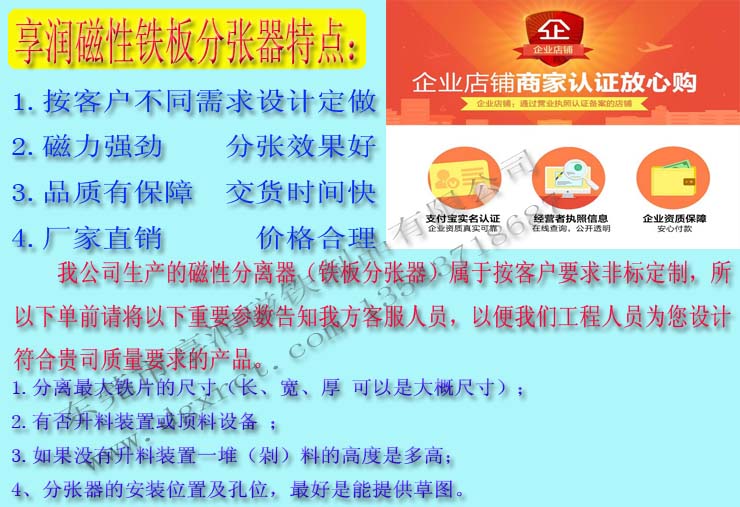 东莞市享润磁铁制品有限公司非标定做:磁性铁板分层器 冲压铁片分张器、磁性分离器、不规则异型强力磁铁、气缸磁环、油缸磁环、磁性滚筒、磁力棒、磁力架、自动脱铁捡铁器等。24小时电话(微信):135 4371 8687 0769-83060329 http://www.dgxrct.com QQ:346437040 515341956