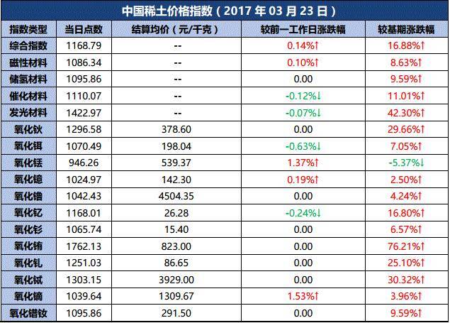 截至3月23日,稀土综合价格指数报1168.79点,较前一工作日上涨1.59点,涨幅为0.14%;较比基期(2016年10月31日)上涨168.79点,涨幅为16.88%,再创新高。